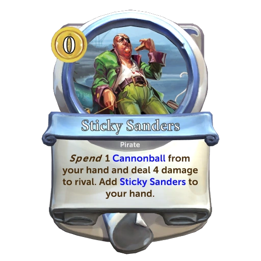 Spend 1 Cannonball from your hand and deal 4 damage to rival. Add Sticky Sanders to your hand.