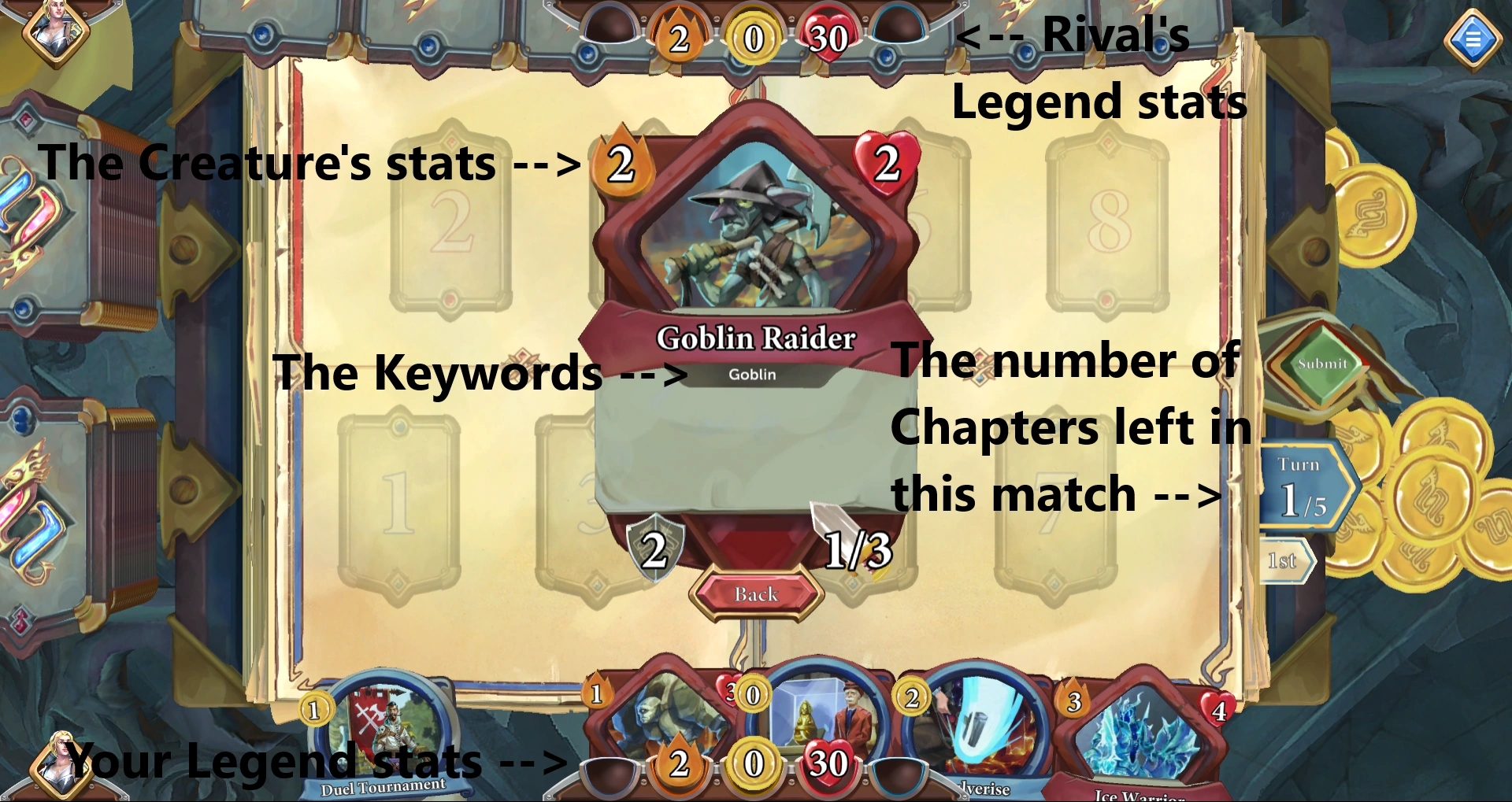 The goal in Chronicle: Rewritten is to win matches by reducing the Health of your opponent's Legend to 0 or less, thereby killing them, before your legend's Health falls to 0 or less and dies. As a player, you can play as 6 different Legends: Ariane, Linza, The Raptor, Ozan, Vanescula and Morvran. The opponent (called the "Rival") may be either a computer player (in "Solo Play" mode) or a human player (in "Play" mode). Playing the game consist of dragging Cards from your hand onto "Slots". Cards do things like give your Legends Gold, Armor, Health and Weapons, and damaging the enemy Legends. The two main types of Cards are Support Cards and Creature Cards. Before each game, you select a Deck to use. In each game, you only draw cards which are in your Deck, wich contain minimum 30 cards. At the beggining of the game, if you start first you draw 6 cards but if you play second, you draw 7 cards. After the inital drawing phase, players will have to choose which cards they keep in their hand with a Mulligan. Each new turn, you draw 3 cards.